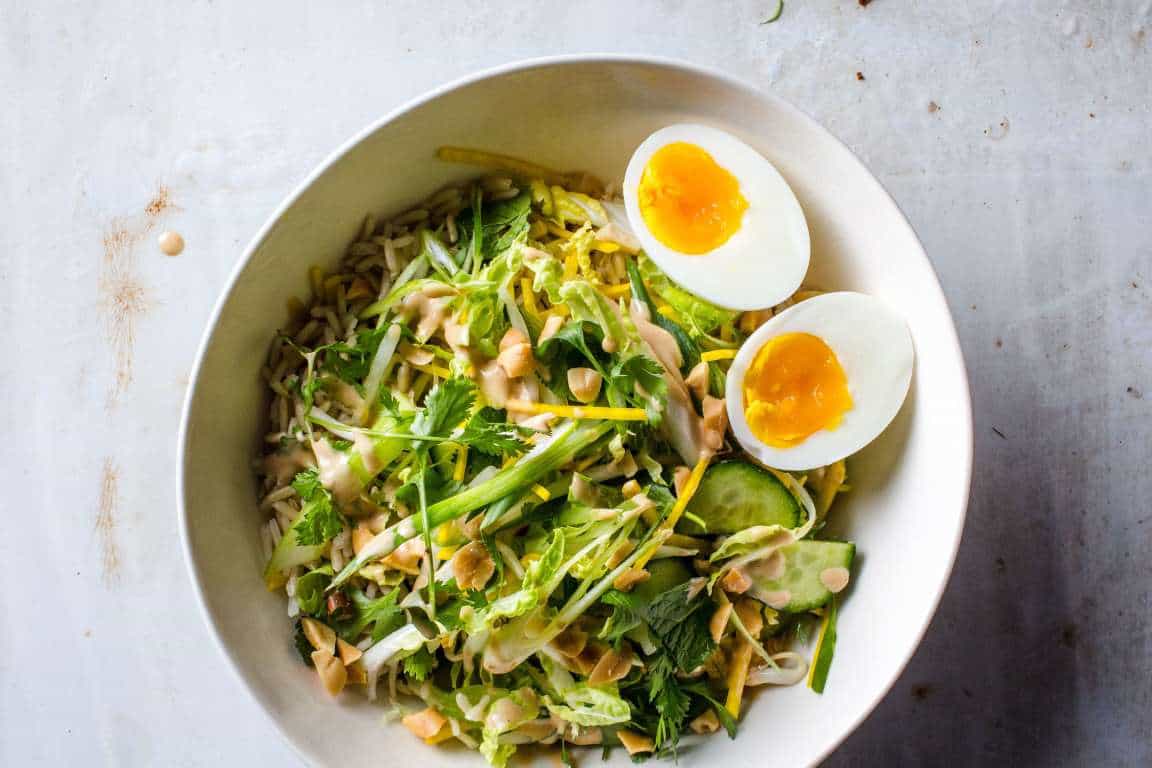 Brown rice and crunchy veggie bowl with peanut sauce